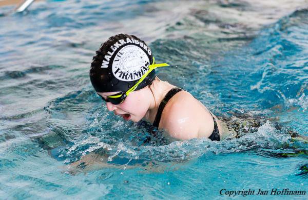 In Altötting fand am vergangenen Samstag das 2. Nachwuchsschwimmen für die Jahrgänge 2006 und jünger statt. Mit 17 Schwimmerinnen waren die VfL Piranhas Waldkraiburg stark vertreten und konnten die Konkurrenz mit ihren Leistungen beeindrucken. In über der Hälfte der Starts konnte sich eine Piranhas einen Platz auf dem Podest erschwimmen, das hieß ganze 41 Medaillen gingen an diesem Tag nach Waldkraiburg. Sophia Bartos (JG 2009), Anika Tschesche (JG 2008) und Michelle Hoffmann (JG 2006) erreichten in jedem ihrer Rennen Platz eins. Sophia konnte außerdem sowohl ihre Zeit über 100m Lagen als auch über 100m Freistil um jeweils sieben Sekunden verbessern. Michelle freute sich besonders über die Zeit auf 200m Rücken, sie schaffte es erstmals mit ihrer Zeit von 02:39,68 Minuten unter der magischen 02:40 Minuten-Marke zu bleiben. Anika wagte sich erstmals auf der 100m Schmetterling Strecke an den Start und erreichte über 100m und 200m Freistil neue Bestzeiten. Simone Matschi (JG 2008) überzeugte erneut mit bestechender Form. Sie konnte ihre erst im Februar geschwommene Bestzeit über 200m Freistil um über zehn Sekunden auf 02:53,31 Minuten drücken und durfte bei jedem Rennen auf das Podest. Sie nahm zweimal Gold und je einmal Silber und Bronze mit nach Hause. Auch ihre Jahrgangskollegin Nina Huber verbesserte sich stark und durfte wie Simone für jeden Start eine Medaille abholen, sie gewann dreimal Silber und einmal Bronze. Ebenfalls im Jahrgang 2008 an den Start ging Franziska Bögl, die mit eindrucksvollen Steigerungen auf allen Strecken aufwarten konnte, über zwölf Sekunden drückte sie ihre alte Bestmarke auf 200m Freistil. Außerdem freute sie sich über eine Gold- und eine Bronzemedaille. Alina Sophie Trautbeck, Johanna Partsch und Sude Yesilyurt, die ihren ersten Wettkampf schwamm, vervollständigten das Team des wieder einmal stark besetzten Jahrgangs 2008 und erbrachten tolle Leistungen. Alina Sophie freute sich besonders über eine Silbermedaille über 50m Rücken. Ebenfalls noch relativ neu im Wettkampfgeschehen sind Tiana-Thora Toth (JG 2011), Stella Zielezny und Sophia Hechfellner (beide JG 2009) aber auch sie stellten unter Beweis, dass bei den Piranhas der Nachwuchs in den Startlöchern steht. Stella durfte sich über eine Gold- und eine Silbermedaille freuen. Und auch die älteren Vereinskameradinnen zeigten gewohnt starke Leistungen. Isabella Dohmen (JG 2007) erreichte ausnahmslos persönliche Bestzeiten und nahm über 50m Freistil zudem die Bronzemedaille mit. Im Jahrgang 2006 gewann Sara Golea zwei Silbermedaillen, Tanja Steinböck und Elena Stefanidis schwammen über jede Distanz eine neue Bestzeit und erreichten für jeden Start einen Platz auf dem Podest. Spannend wurde es über 200m Brust, hier lieferten sie sich ein packendes Kopf-an-Kopf Rennen, das Tanja knapp für sich entscheiden konnte. Den dritten Platz erreichte mit Anja Huber eine weitere Waldkraiburger Schwimmerin. Über 50m Schmetterling durfte Anja dann ganz oben stehen und sich die Goldmedaille überreichen lassen. In den Osterferien wird ein großer Teil der Piranhas im Trainingslager weiter an Technik und Ausdauer feilen, um für die kommende Freibadsaison bestens gerüstet zu sein.